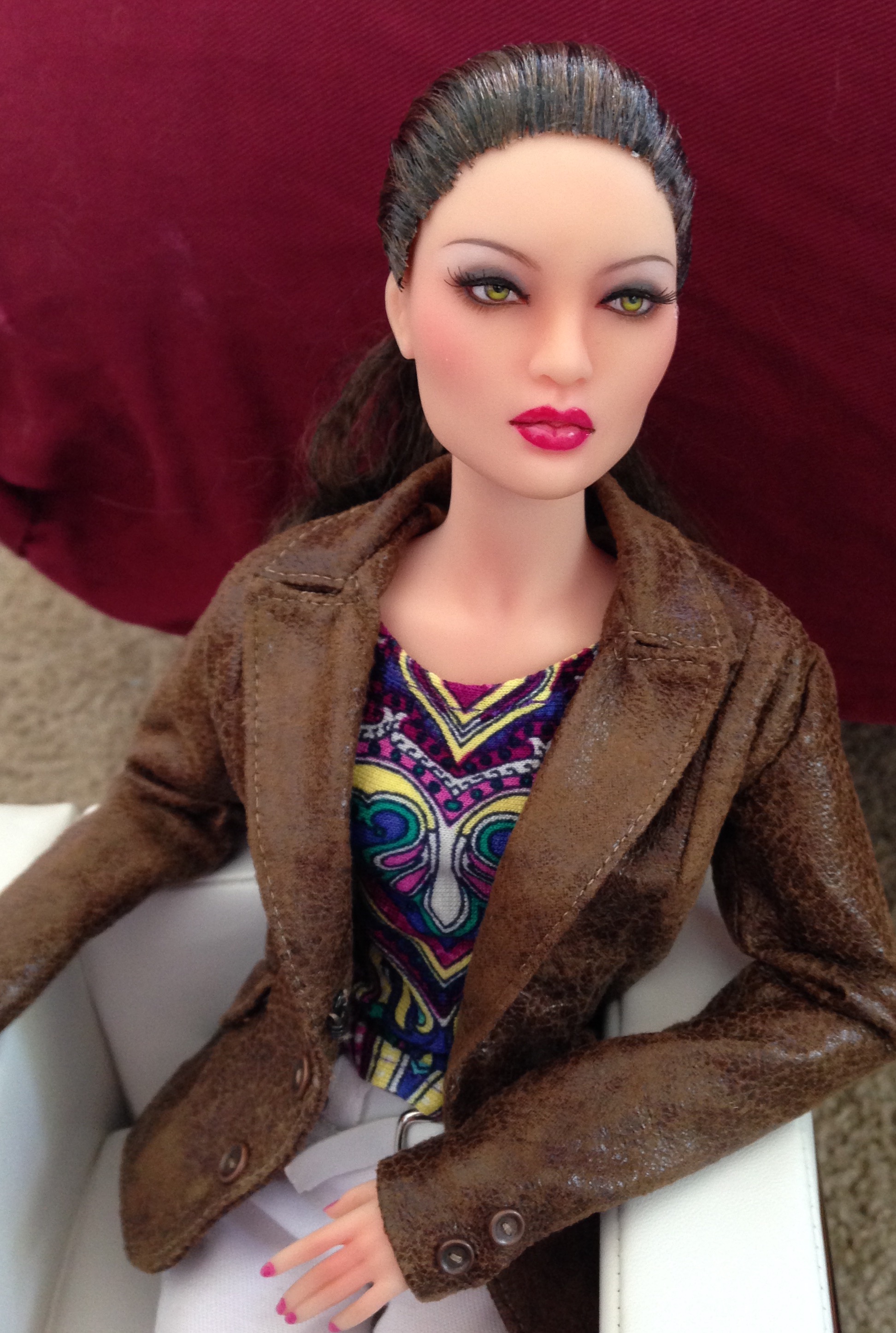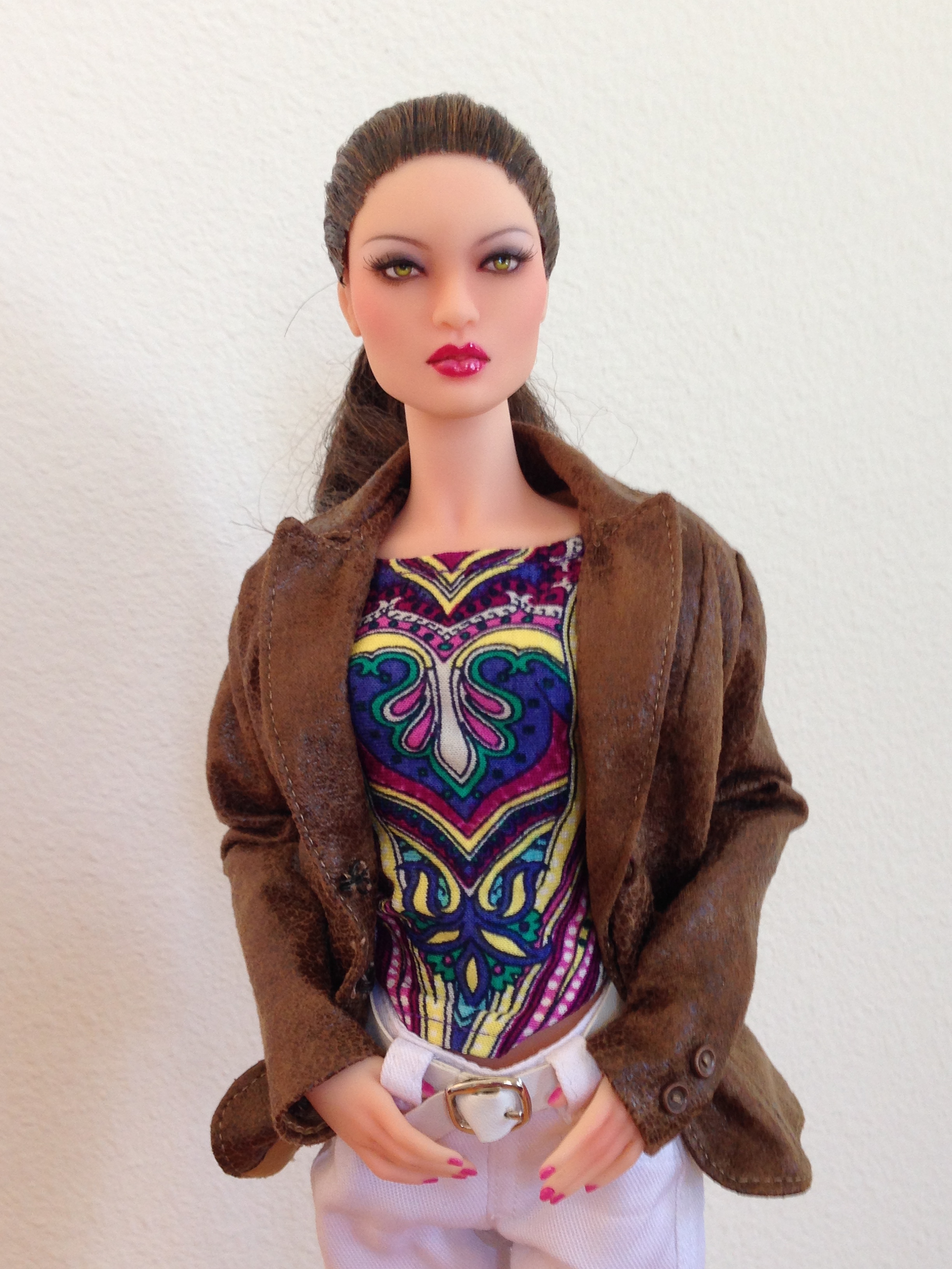Sung looked great in every look I tried on her. She especially favors pink and green, given her pink lips and green eyes. Ultimately, I dressed her in a top from an artist on eBay, a pair of Tonner slacks, and a wonderfully tailored jacket by Yum Yum Couture.