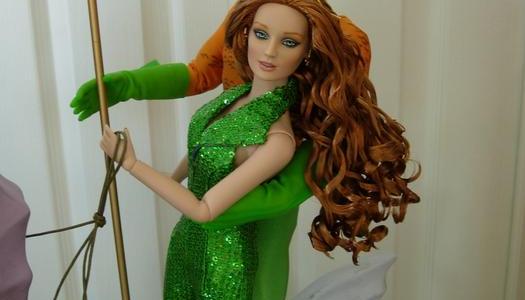 Some of you may remember when Tonner Doll Company created totally over-the top table centerpieces during their annual convention and other events. I’m lucky enough to own two of these heavy, resin creations. My favorite is Aquaman riding his huge purple seahorse, “Storm,” his wife Mera by his side. The other is a street scene in which Rufus (who was making his debut) offers his heart to Ellowyne.