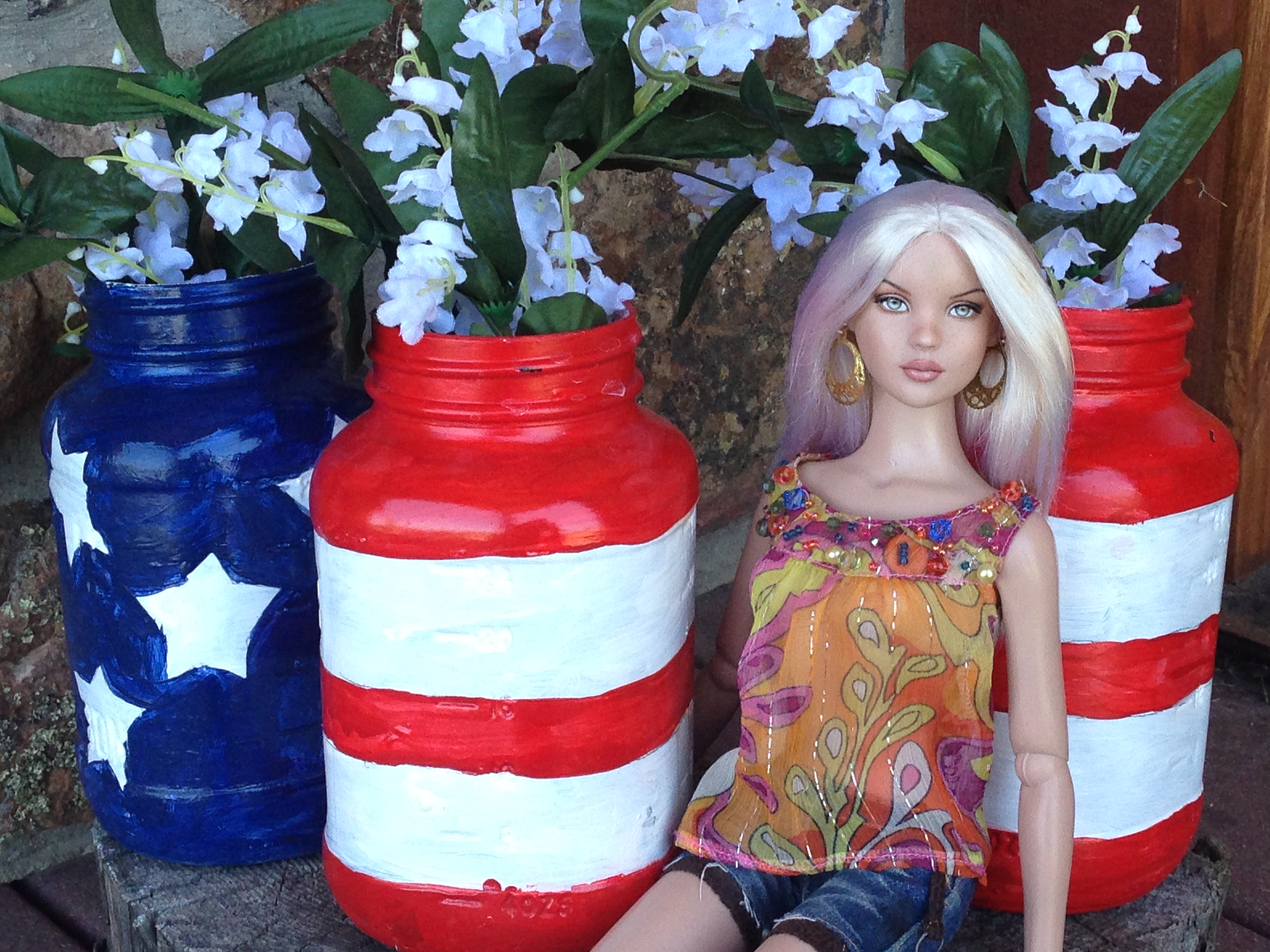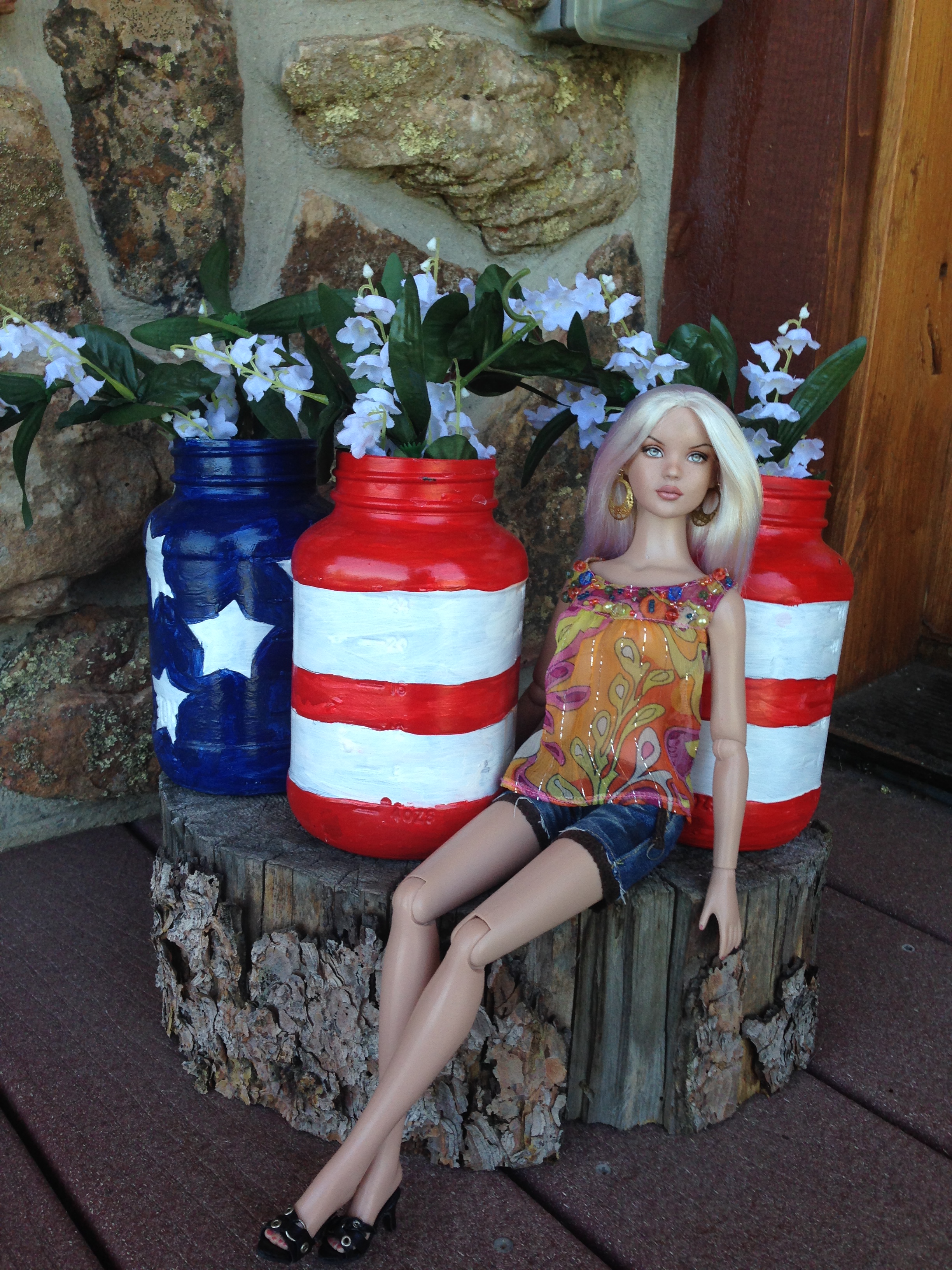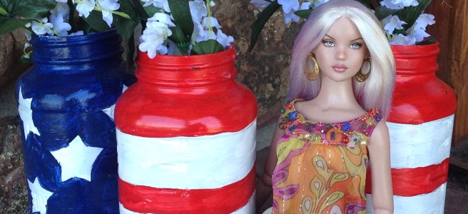 Today my niece and I took our dolls outdoors to photograph them for the Fourth of July holiday. A holiday craft project created by my mother-in-law provided a festive backdrop.